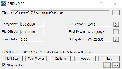 위 그림의 하단부의 UPX 0.89.6 ~~~ 라고 써져 있는 것을 볼 수 있는데 이것은 해당 프로그램이 UPX로 패킹이 되어 있다는 것입니다.