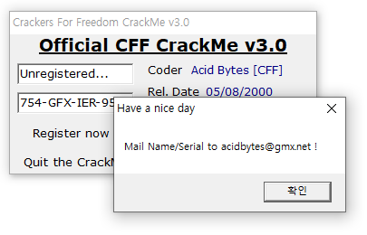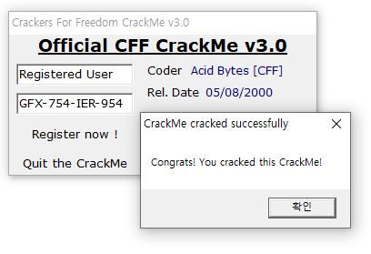 올바른 정답 입력 후, 크랙에 성공했다는 메세지 창이 나왔습니다.