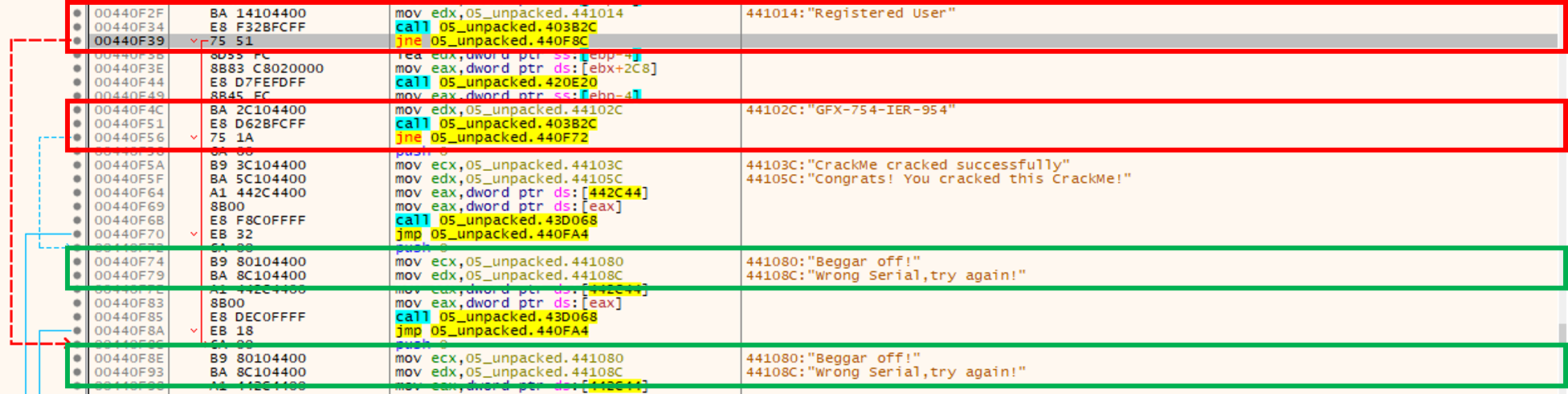 디버거를 통해 확인해 보면 시리얼 키 뿐만이 아니라 'Registered User' 인지도 확인을 하고 둘 중 하나라도 틀리면 가차없이 jmp로 틀리다고 넘어가 버리는 것을 알 수 있습니다.