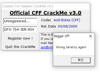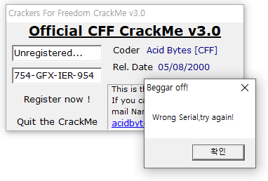 알아낸 시리얼 키를 입력했으나 여전히 틀리다고 나오는 모습입니다.
